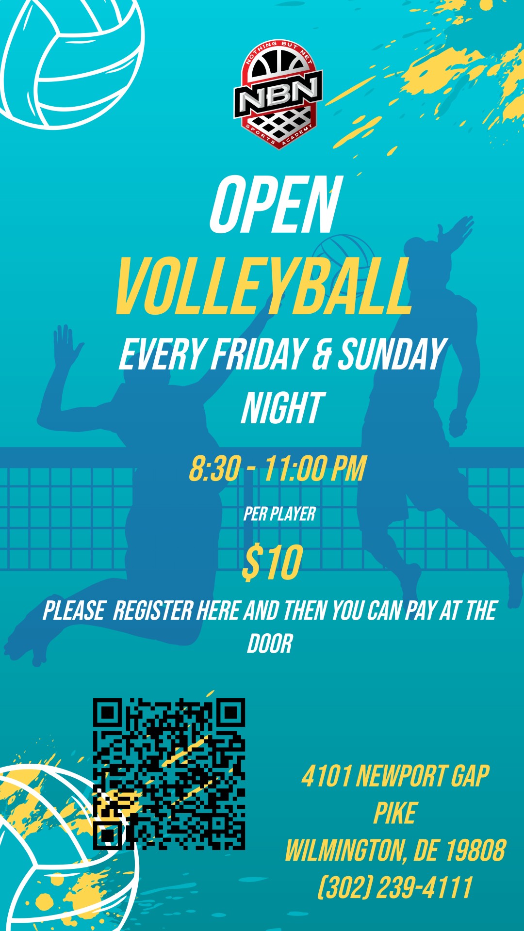 Come every Friday and Sunday for open volleyball. 2-4 courts will be setup and it will be open play from 8:30-11pm